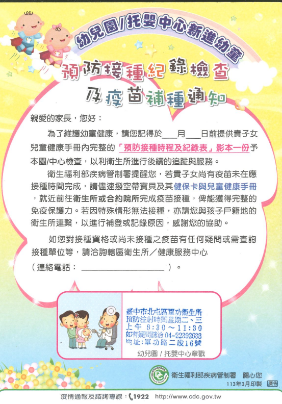 臺中市 北屯區幼兒園/托嬰中心幼兒預防接種未完成名冊