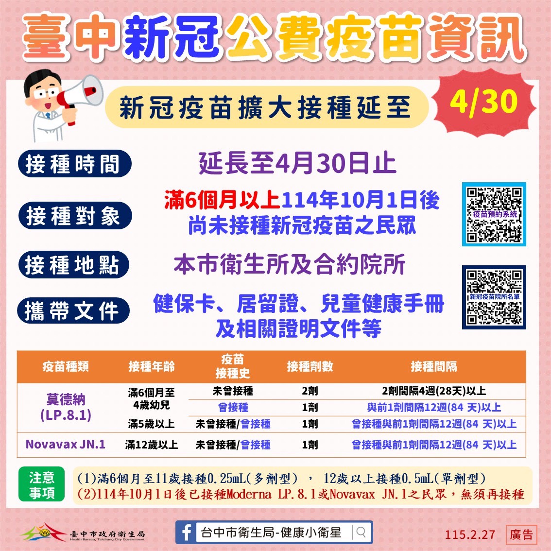 為提升對重症高風險族群的健康保護,自(2026/4/7)起,提供65歲以上長者、55-64歲原住民、滿6個月以上且有免疫不全或免疫力低下患者,再增加接種1劑新冠疫苗,兩劑需間隔180天以上。